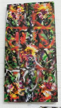 Acrylic, spray paint on used canvas
