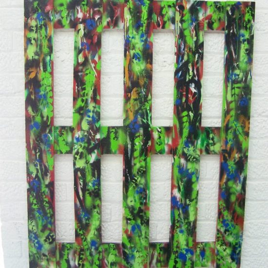 DIRTY GREAT FLOWER – A piece of a found piece of wooden packing case, 1 metre square. Acrylic, marker pen, spray paint