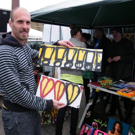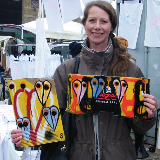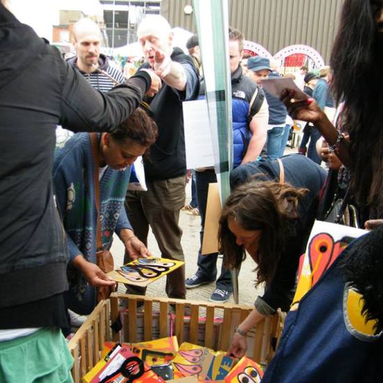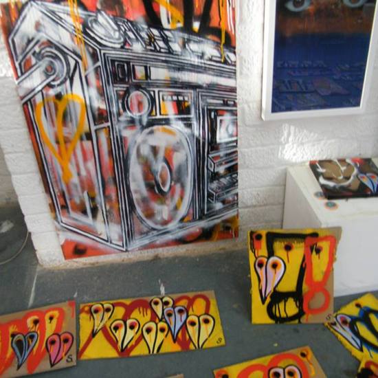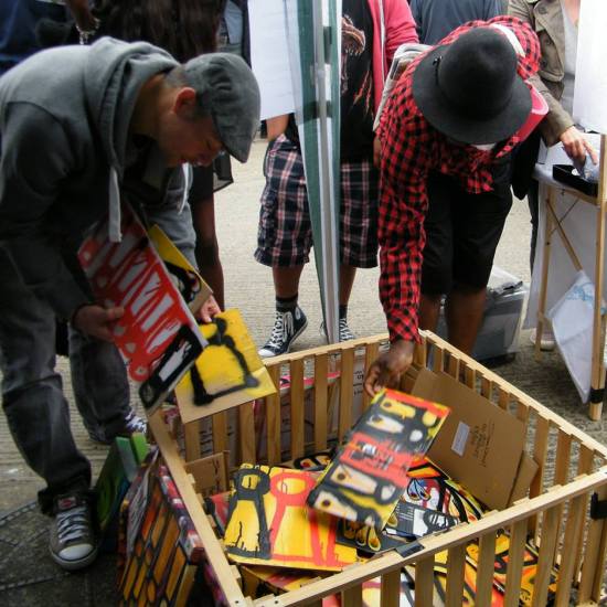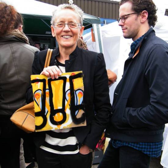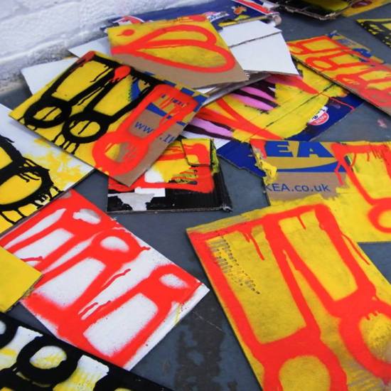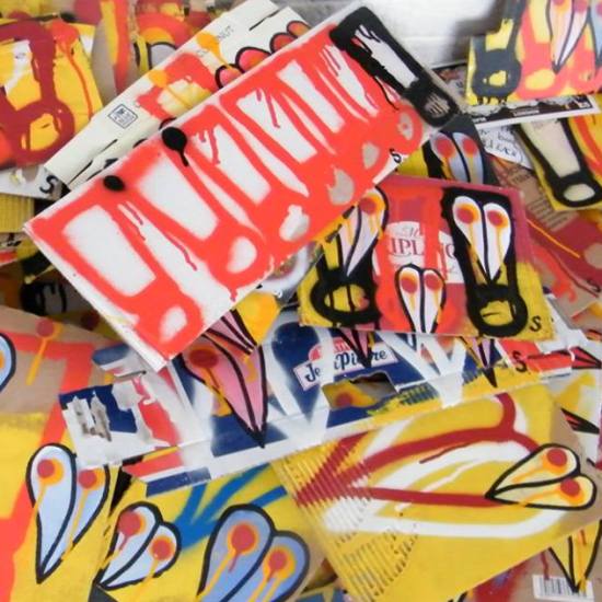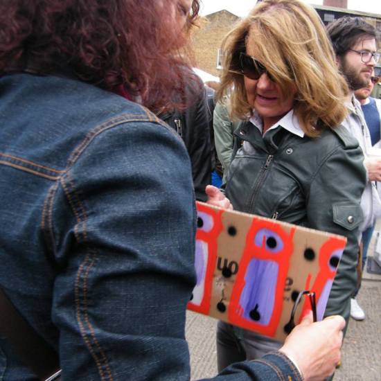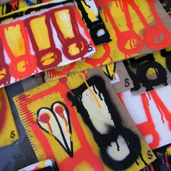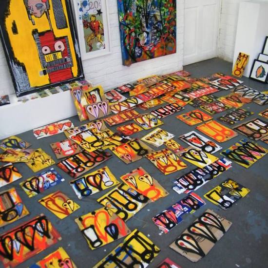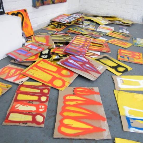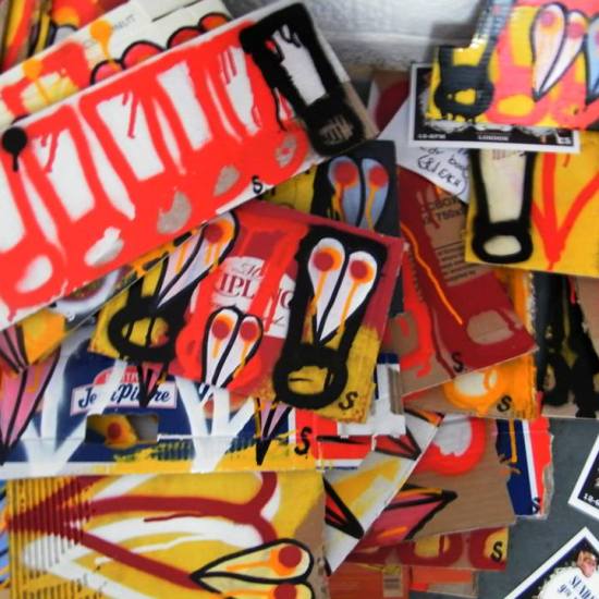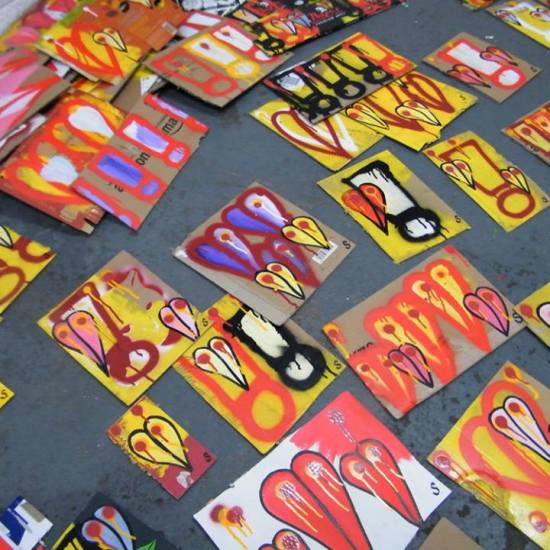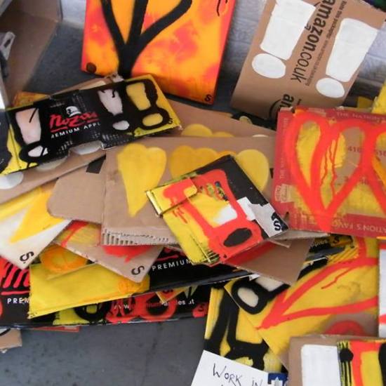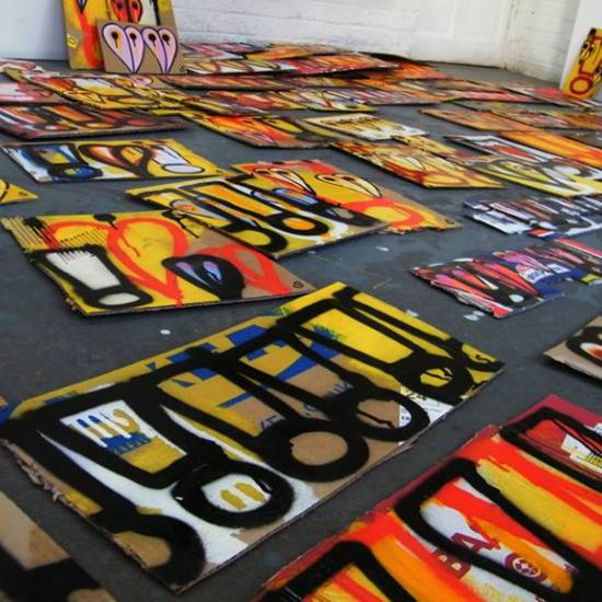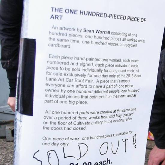 The first of three one hundred pieced pieces painted in 2013. A piece of work consisting of one hundred pieces, all painted at the same time, on recycled pieces of cardboard picked up on Vyner Street.. All painted in the last week or May and the first week of June, on the floor at Cultivate. Each part pf the piece sold for £1 and 2013 Brick Lane Art Car boot Fair (all one hundred pieces sold out within thirty minutes of the opening, some of them were being sold on via ebay the next day, some of them ended up in frames, One piece of art shared out between one hundred people. .