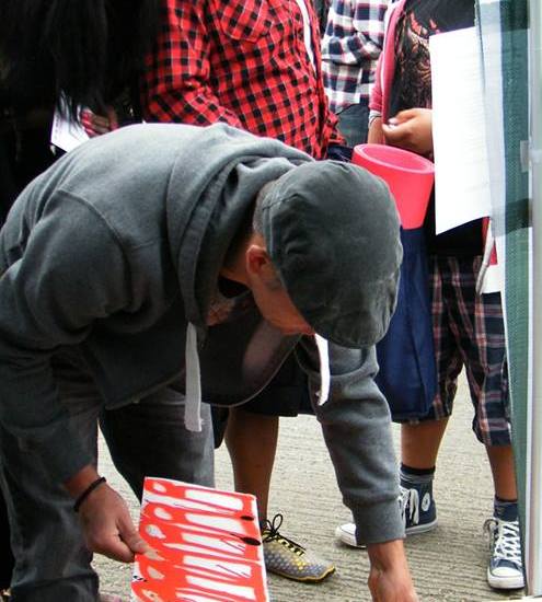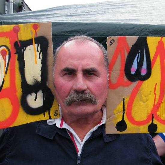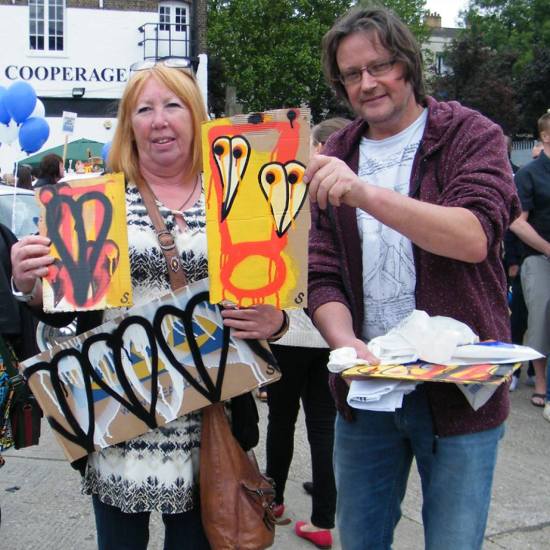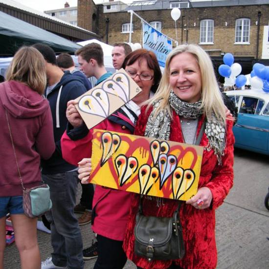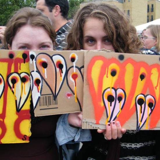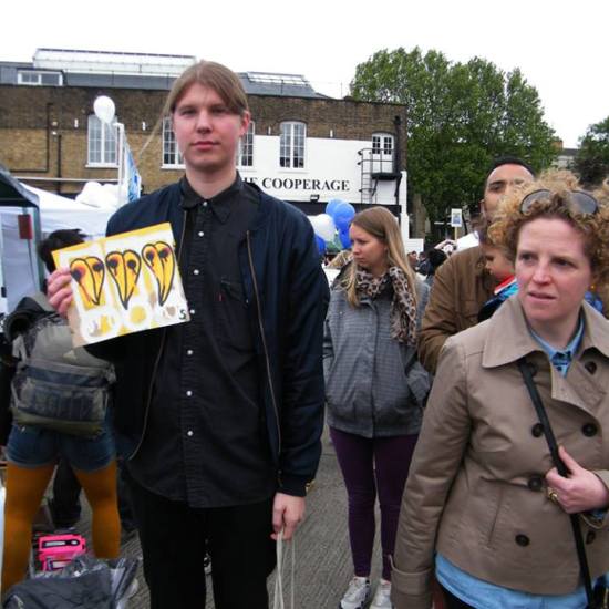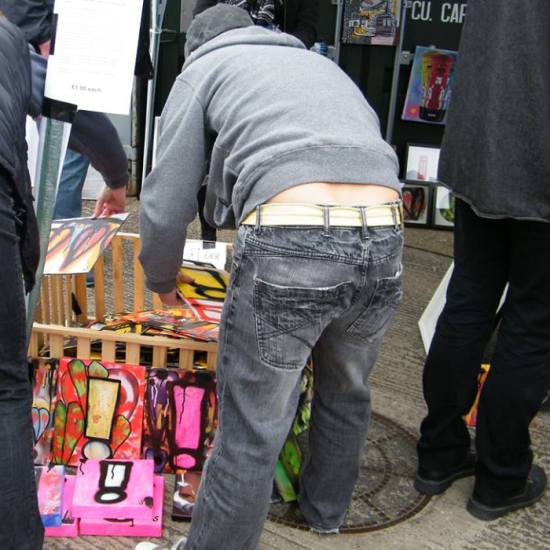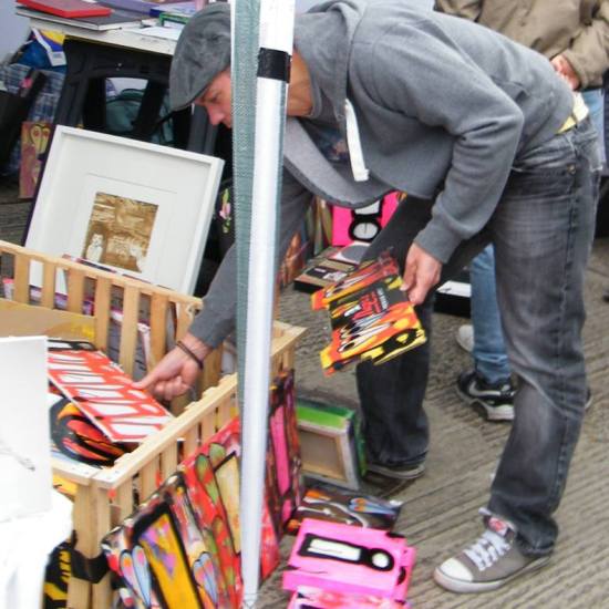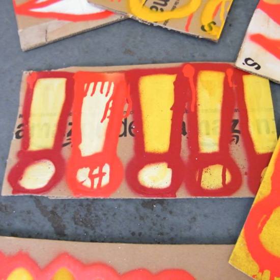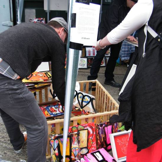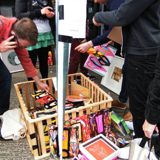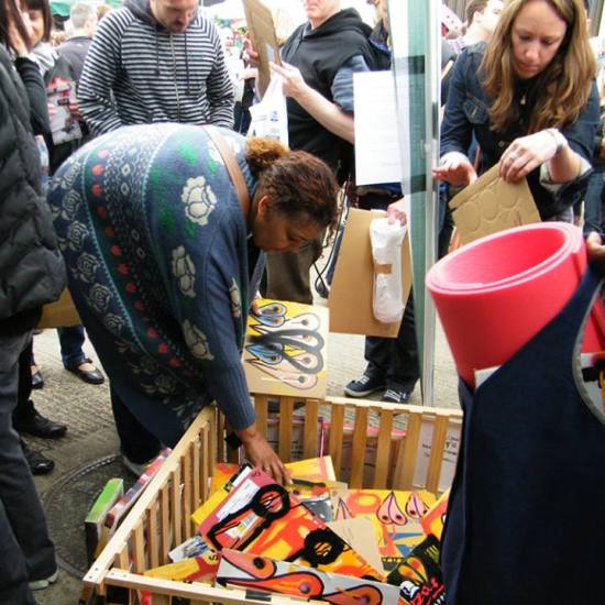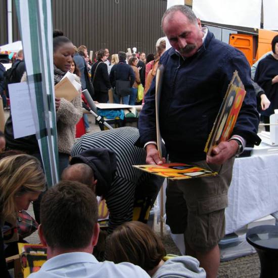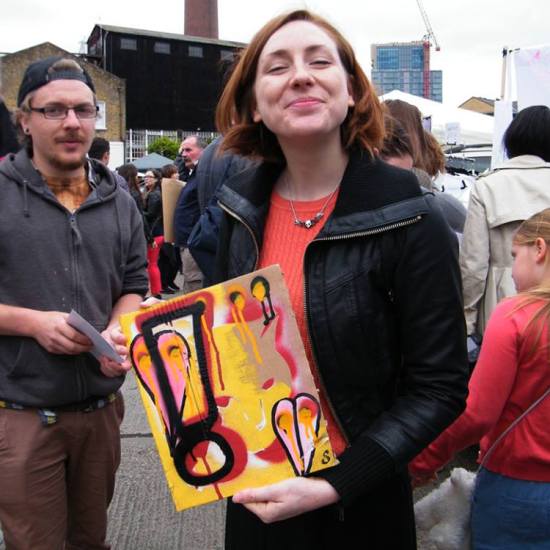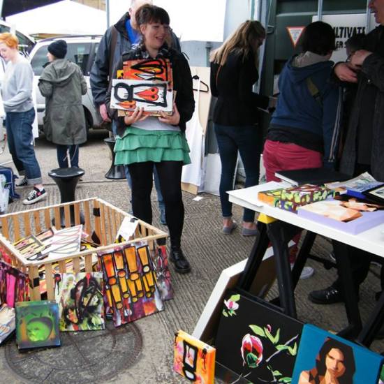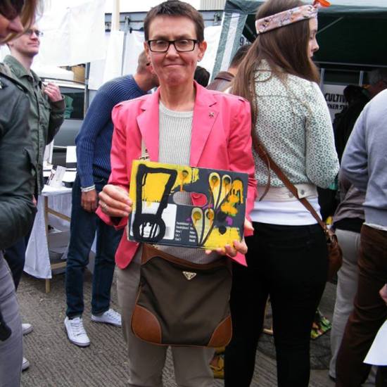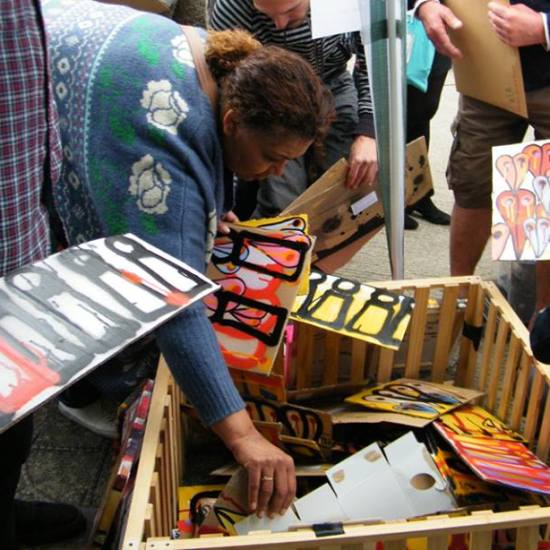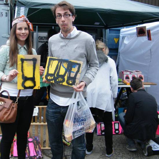 The first of three one hundred pieced pieces painted in 2013. A piece of work consisting of one hundred pieces, all painted at the same time, on recycled pieces of cardboard picked up on Vyner Street.. All painted in the last week or May and the first week of June, on the floor at Cultivate. Each part pf the piece sold for £1 and 2013 Brick Lane Art Car boot Fair (all one hundred pieces sold out within thirty minutes of the opening, some of them were being sold on via ebay the next day, some of them ended up in frames, One piece of art shared out between one hundred people. .