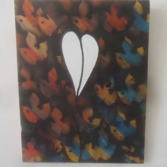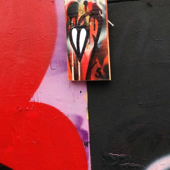 (2016 – Acrylic, marker pen on recycled wood 60cm x 33cm)